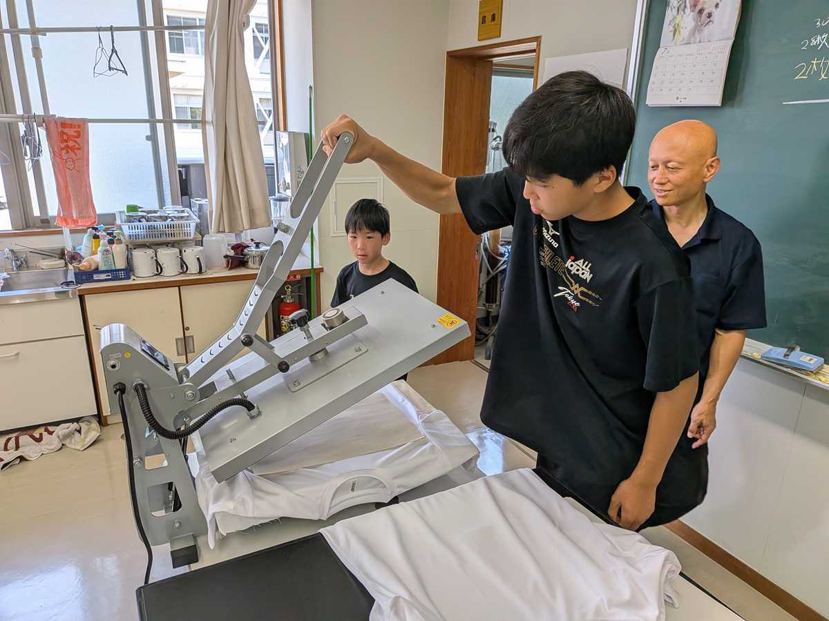 今治工業高校繊維デザイン部、ちびっこレスラー、中学生、今治工業高校レスリング部でTシャツを作成しました。